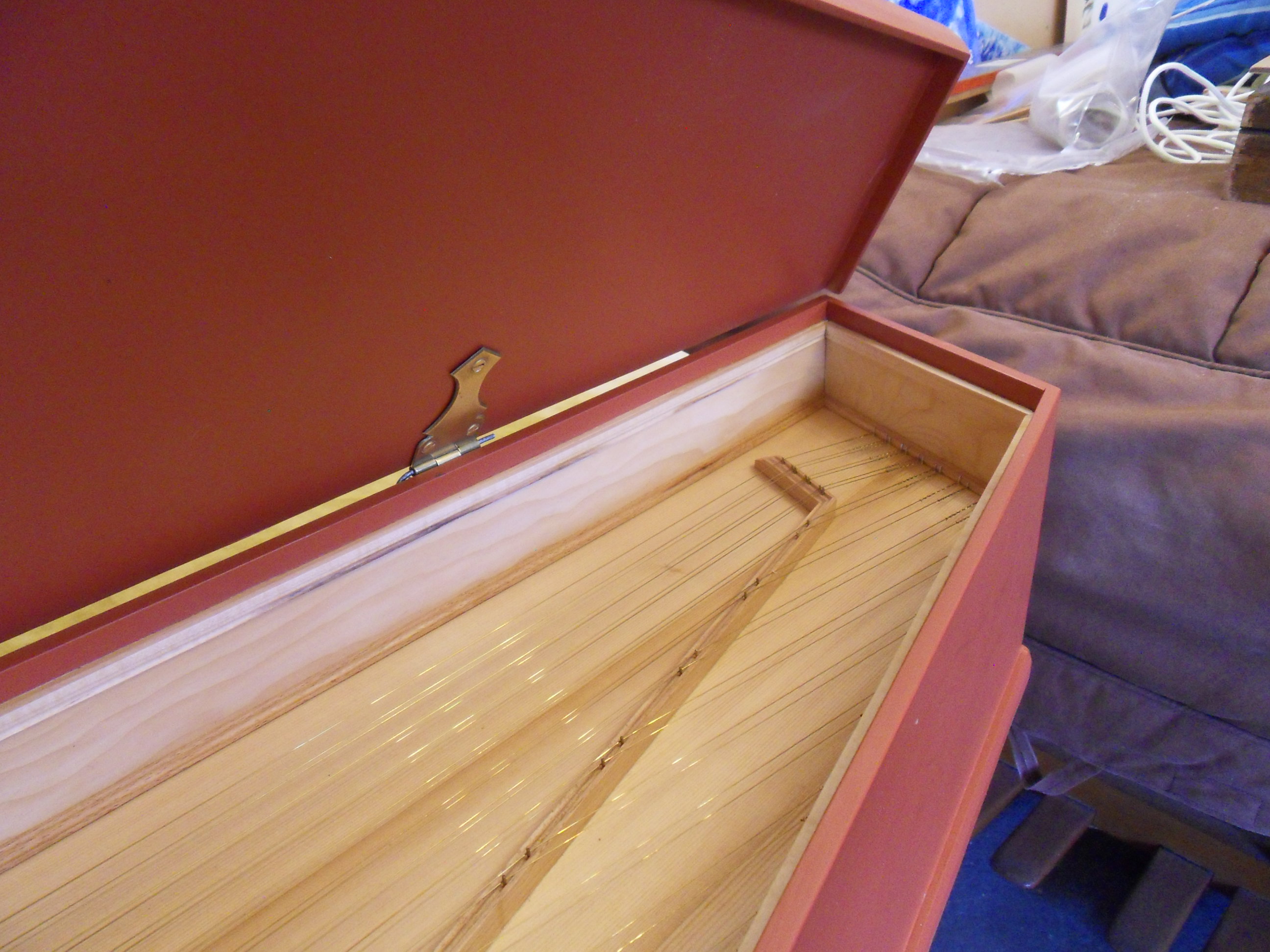 Peter Barnes has now finished the instrument and is is provided with 2 x 8' stops with buff stop and a transposing compass from C-d3 in both a=415 and 440 pitch.